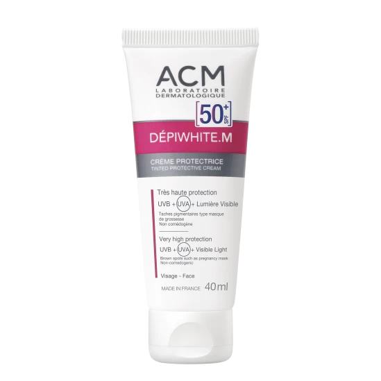 Laboratoire ACM Dépiwhite.M Crème Protectrice SPF 50+ 40 ml à la texture fluide et invisible est un soin visage qui offre une très haute protection solaire invisible qui aide à prévenir l’apparition ou l’aggravation des taches pigmentaires type masque de grossesse ou mélasma.